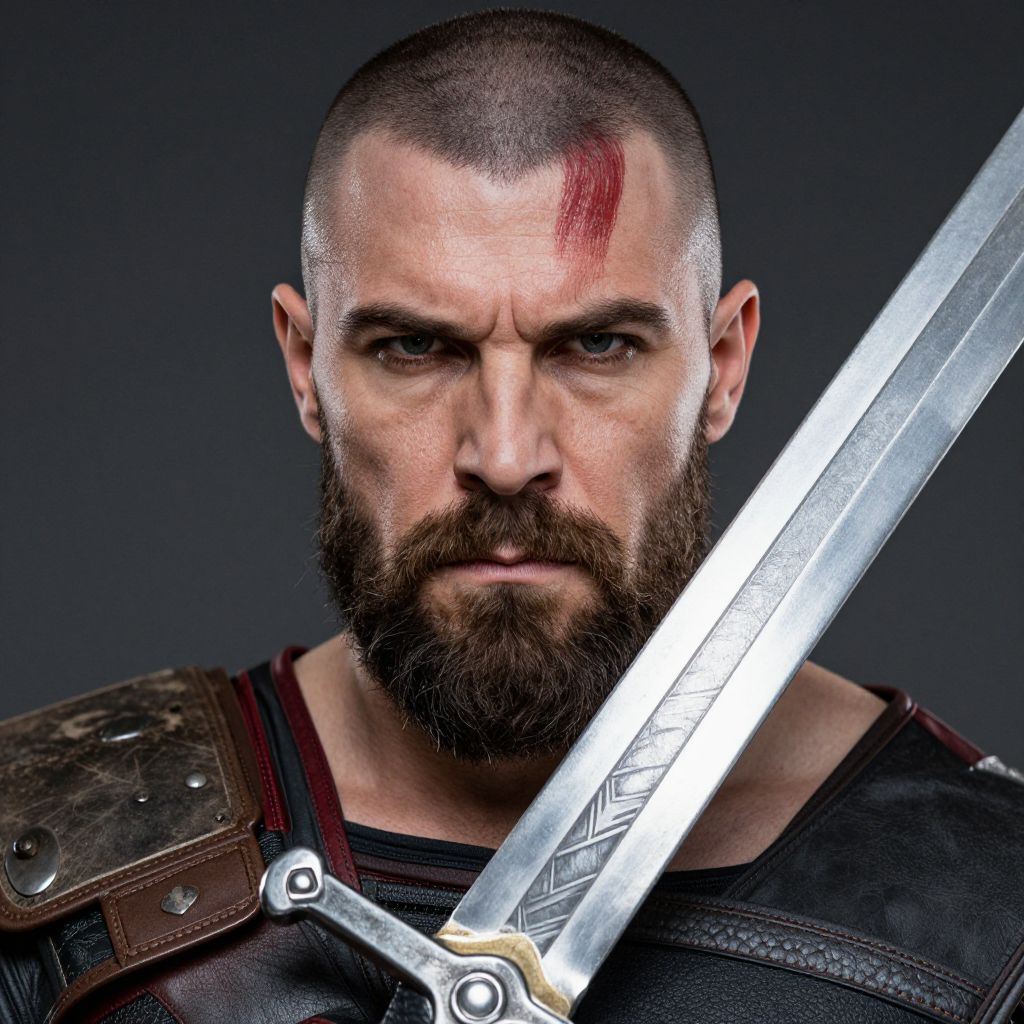 Photograph of a bearded, bald man with a blood-stained forehead, intense expression, holding a large, ornate sword, wearing leather armor