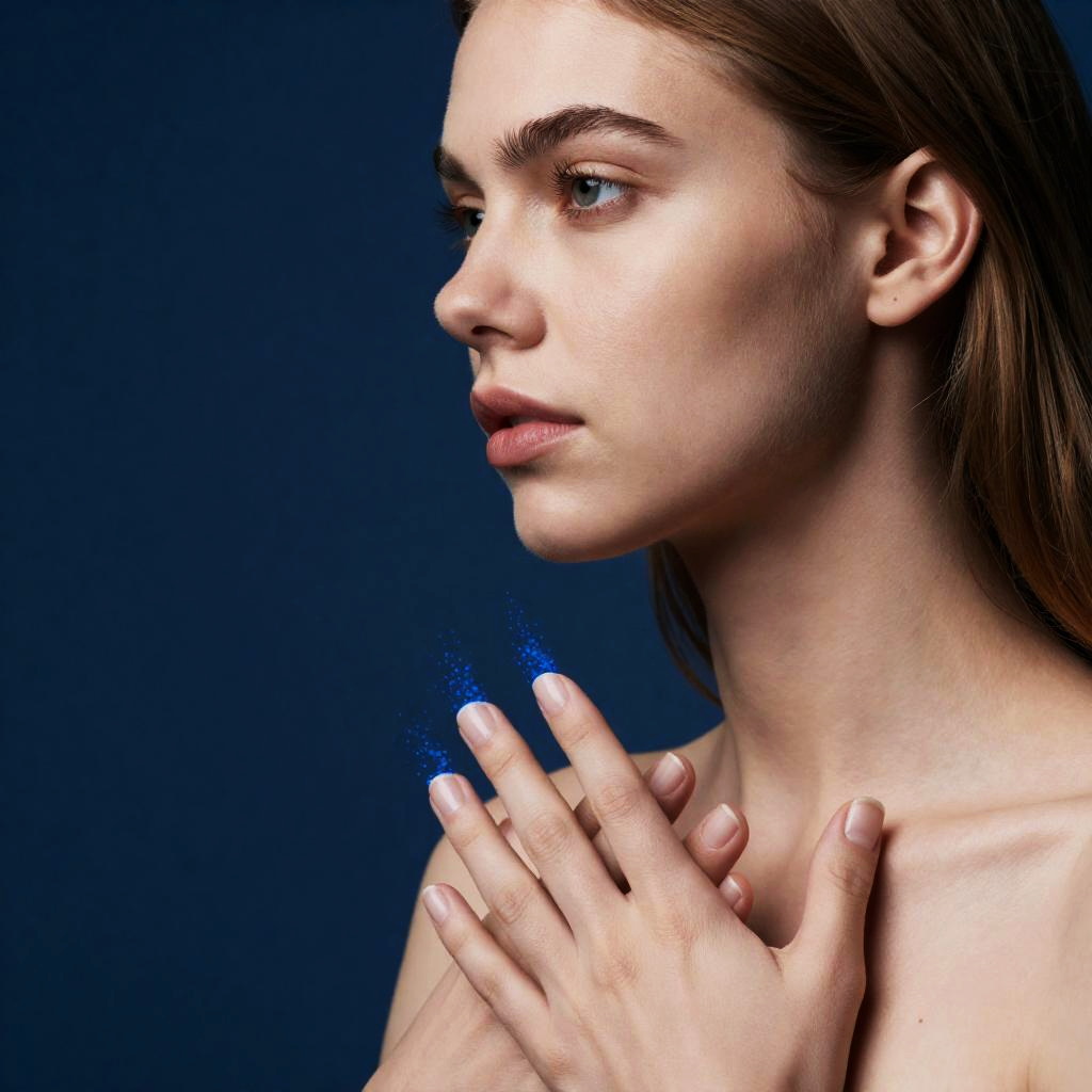 Photograph of a topless woman with light brown hair, fair skin, and full lips, facing left. She covers her chest with her hands, blue pixel-like particles emerging from her fingers. Blue background. Side profile. Intense gaze.
