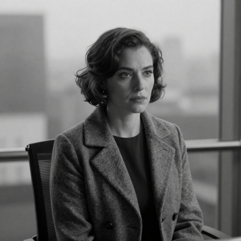 Black-and-white photograph of a serious-looking woman with short, wavy hair, wearing a ured, patterned coat over a dark top. She sits in a modern office chair with a blurred cityscape background. Her intense gaze is directed slightly to the right. The lighting highlights her facial features and coat ure.