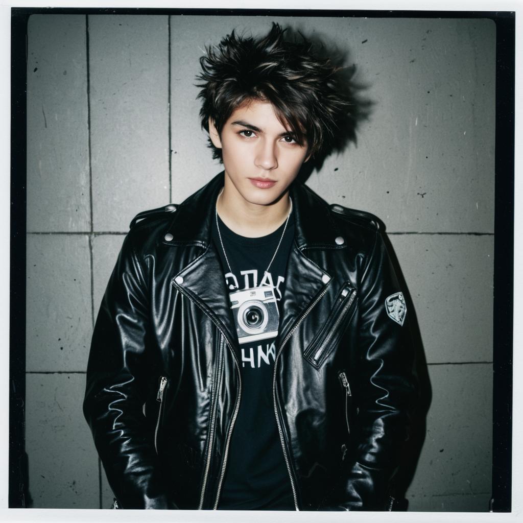 Laucha clubbing cosplay, Gustavo Almada, young man with short messy hair, black leather jacket, graphic tee, casual cool outfit, polaroid, full body shot