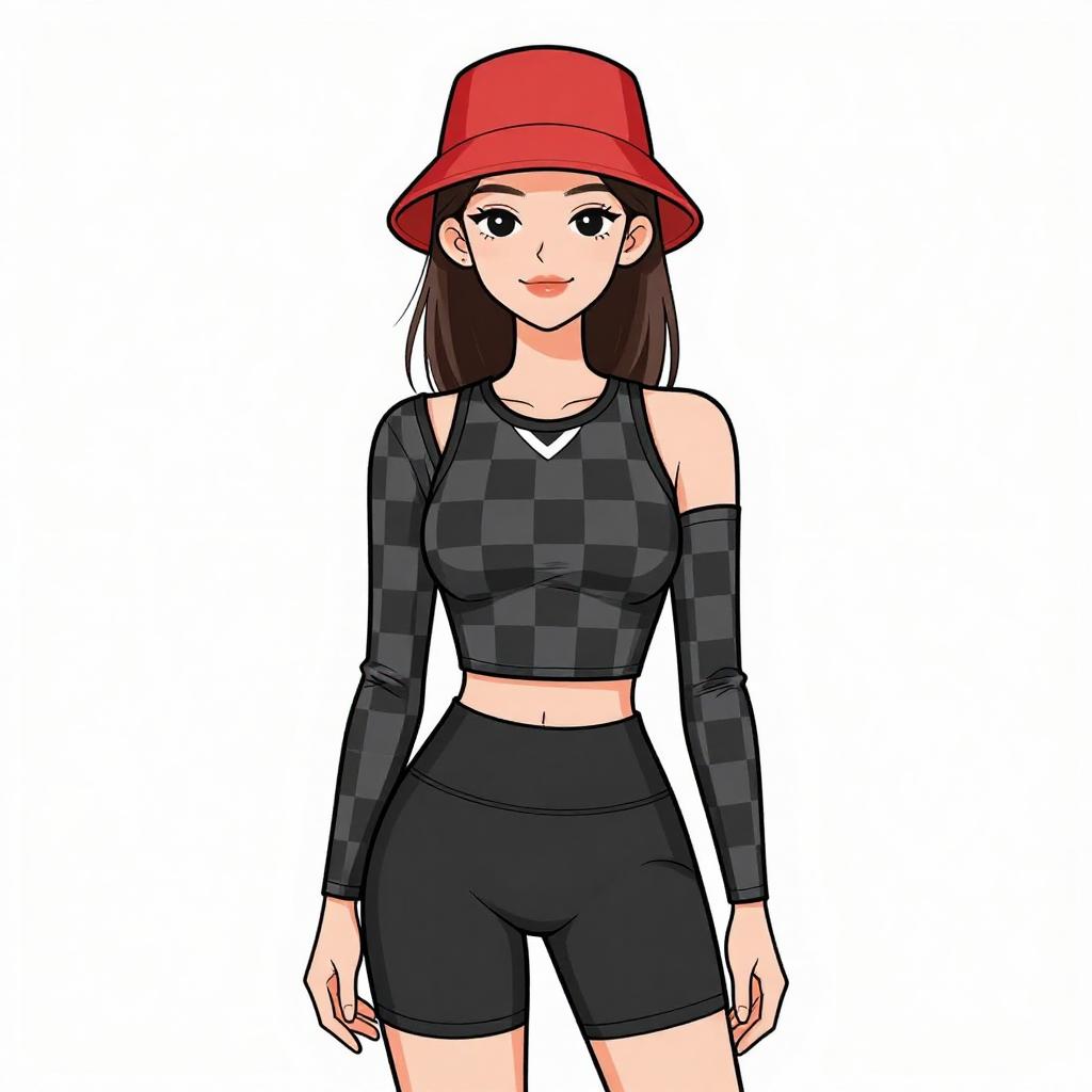 This is a digital anime-style drawing of a young woman with fair skin and long black hair. She wears a bright red bucket hat, a black and gray checkered crop top with long sleeves, and black high-waisted shorts. Her top has off-shoulder sleeves, revealing her shoulders. She has large, expressive brown eyes, a small smile, and a slender build. The background is plain white, emphasizing her outfit and appearance. The drawing uses bold, clean lines and a limited color palette, typical of anime art.