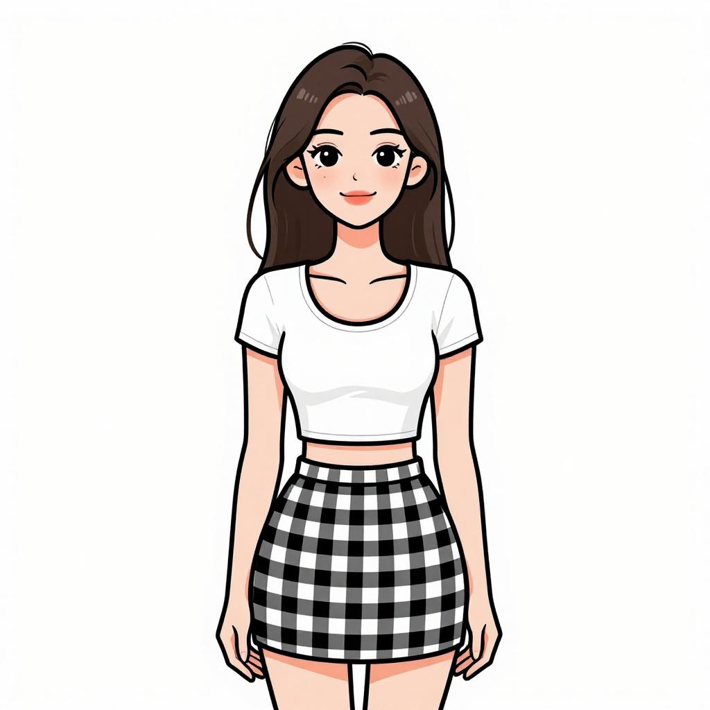 Digital anime-style drawing of a young woman with long black hair, wearing a red bucket hat, black checkered crop top, and black shorts, standing