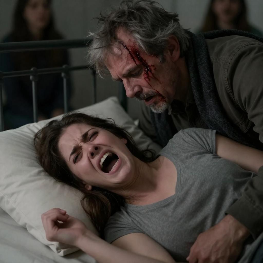 Photograph of a distressed woman with brown hair, screaming with mouth open, lying on a bed. An older man with messy gray hair, blood on his face, and intense expression leans over her, partially obscured by a dark, ured scarf. Background includes a metal bed frame. Two people. Intense facial expressions.