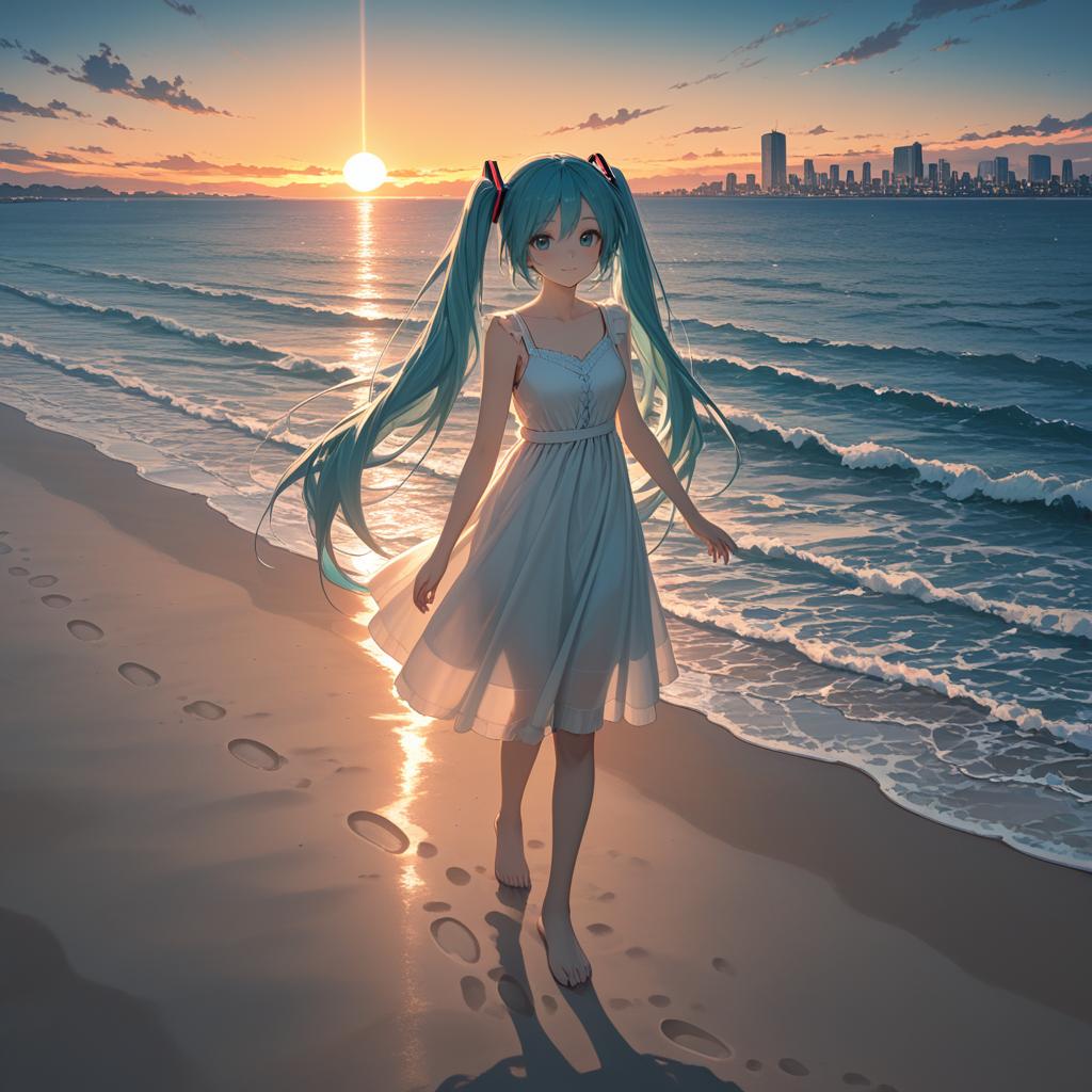 Digital artwork of Hatsune Miku, a popular anime character, walking barefoot on a sandy beach at sunset. She is wearing a white dress and has long turquoise twin tails. The scene features ocean waves, scattered footprints in the sand, and a distant city skyline under a vibrant orange sunset sky.