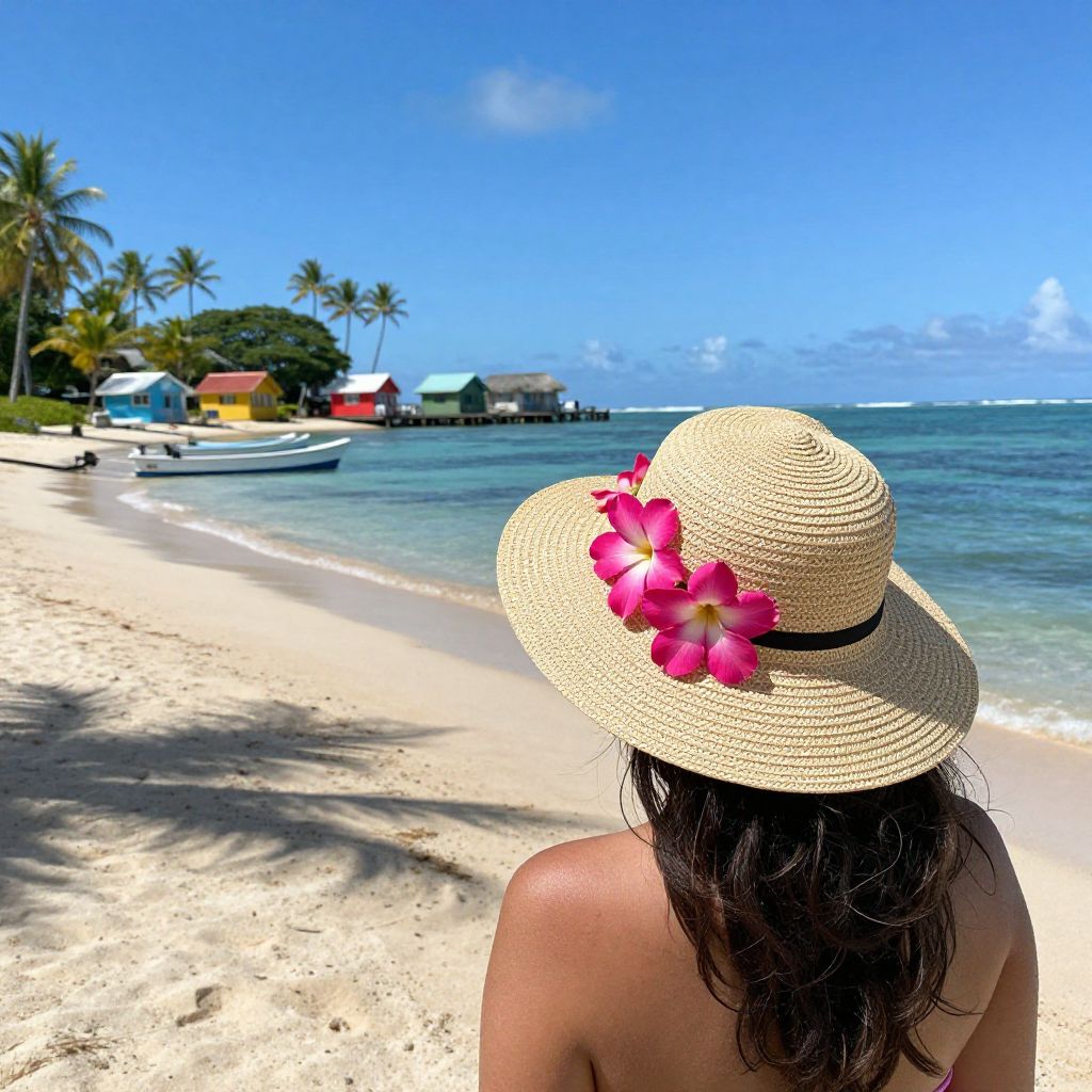 Woman enjoying a serene tropical beach scene in Tahiti, adorned with a straw hat decorated by vibrant pink flowers, overlooking a picturesque shoreline dotted with boats, palm trees, and colorful huts under a clear blue sky.