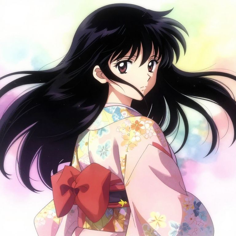 Anime long black hair flowing in the wind, detailed shading and highlights, mysterious female character with deep eyes, traditional Japanese kimono background, soft pastel colors blending with vibrant tones, dynamic pose, high contrast lighting