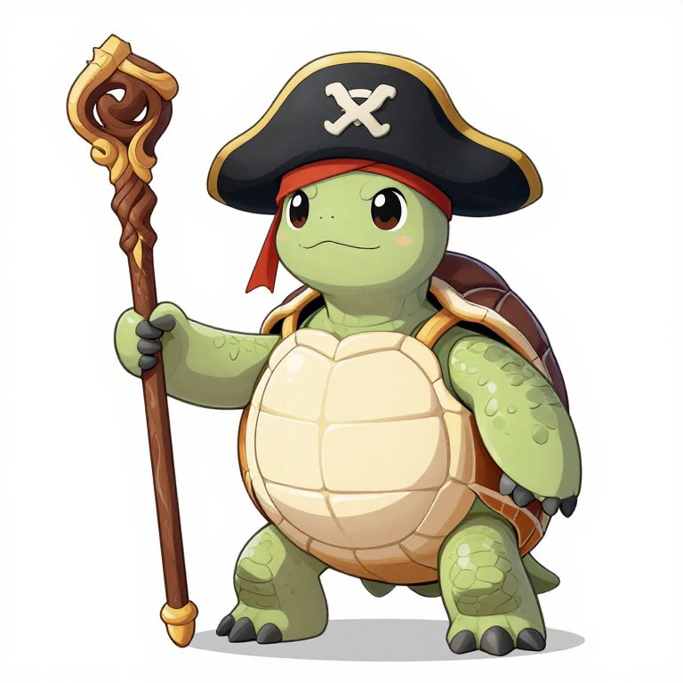 Turtle from kung fu, animated style portrait, fierce expression, detailed shell with engraved symbols, colorful background with flying cherry blossoms, action-ready pose