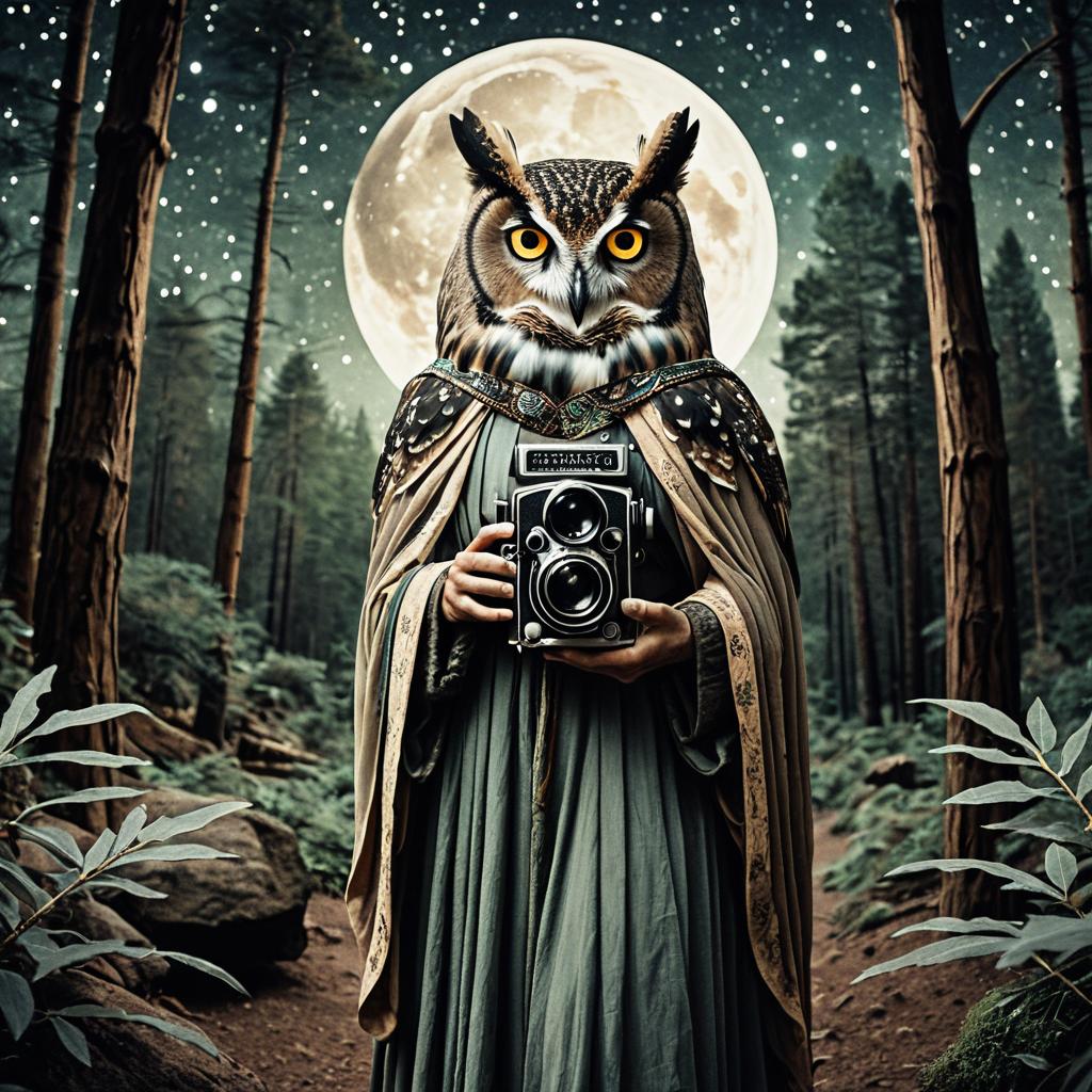Surreal image of a mystic owl sage with glowing yellow eyes, dressed in a flowing silk robe with celestial star print in muted earth tones. The owl-headed figure holds a vintage Hasselblad camera with a 50mm lens. Set against an ancient forest background with tall trees and a large full moon illuminating the scene, evoking a magical and detailed atmosphere.