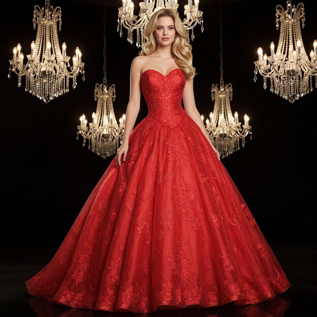 Photograph of a beautiful blonde woman with wavy hair, wearing a strapless, red, lace-embellished ball gown with a full, flowing skirt. She stands confidently in front of a dark background adorned with several elegant, glowing chandeliers. Her dress features intricate floral lace patterns and a sweetheart neckline, adding a touch of glamour and sophistication. The overall scene is luxurious and opulent.