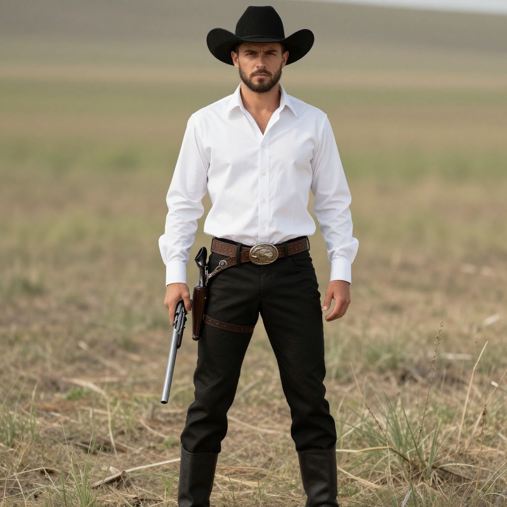 Outlaw costume, 1boy, male focus, solo, hat, shirt, facial hair, belt, standing, pants, boots, holster, realistic, weapon, beard, looking at viewer, gun, cowboy hat, long sleeves, collared shirt, white shirt