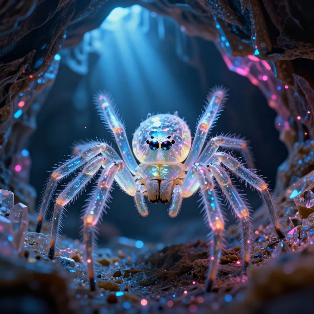 A highly detailed 4K render of a bioluminescent crystal spider inside a glowing neon cave. The spider features a translucent iridescent exoskeleton and vibrant eyes, surrounded by glistening particles and illuminated by intense volumetric lighting. The cave ceiling has glowing blue and pink crystalline formations with surreal crepuscular rays and deep black shadows enhancing the depth of field.