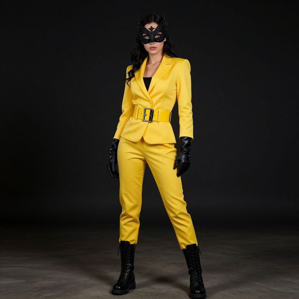 Photograph of a woman in a black mask, standing against a dark background. She wears a bright yellow, tailored, V-neck blazer with black belt and matching yellow pants. She has long, dark hair and black, lace-up boots. Her black gloves add a touch of contrast. The yellow suit stands out vividly against the dark background, emphasizing her confident, superhero-like stance. The image has a high contrast, dramatic lighting, highlighting the bold colors and textures of her outfit.