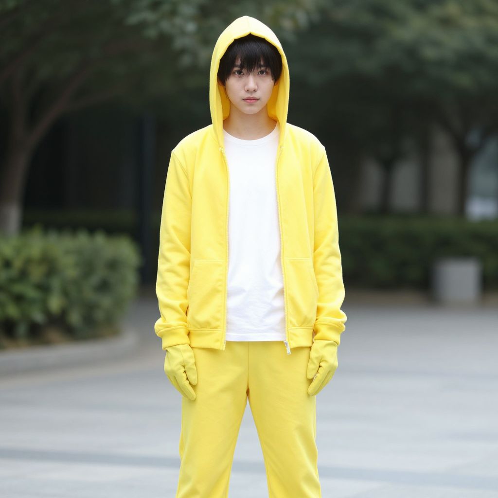 "big hero honey lemon costume, solo, 1boy, male focus, hood, standing, full body, hood up, yellow gloves, gloves, outdoors, jacket Realistic photo of casual sexy person with pretty face"