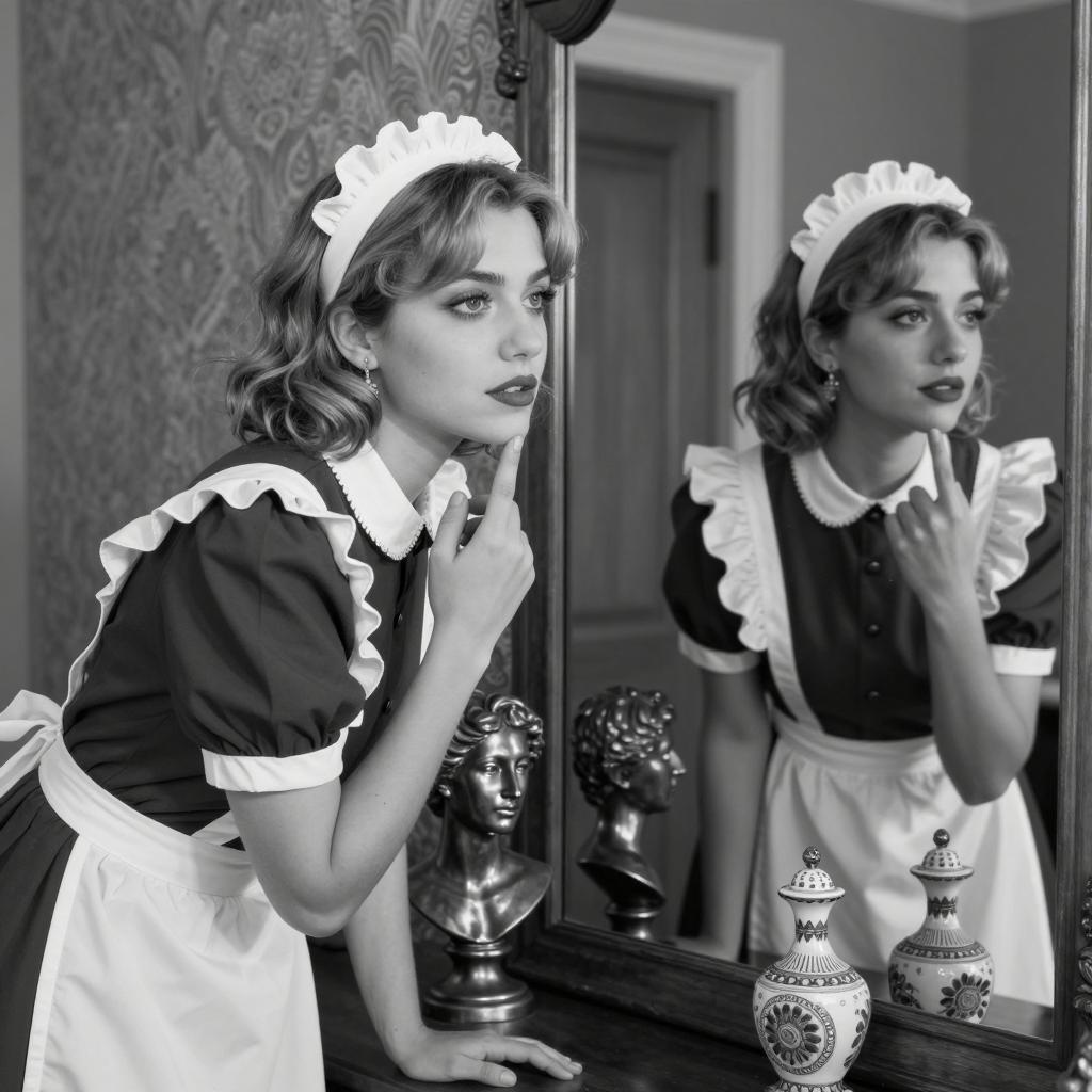 Black and white photograph of a young woman with light skin and short, wavy hair, wearing a dark dress with a white apron and headpiece, leaning forward. Her reflection is in a mirror to the right. She touches her chin with her right hand. The background has a patterned wallpaper and a wooden door. On a table in front of the mirror, there are a bronze bust and two ornate ceramic figures. Her expression is confident. There are two people visible, the young woman and her reflection.