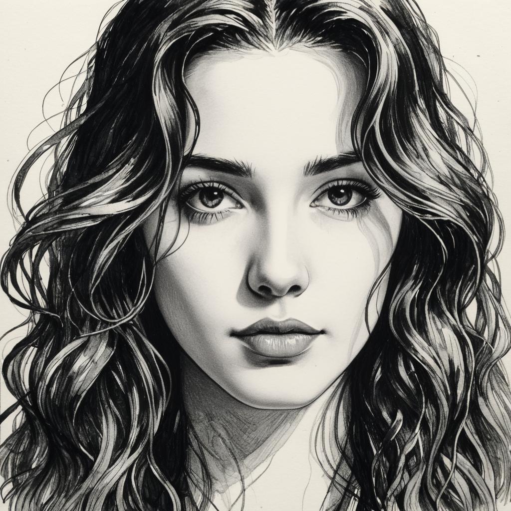 Black and white charcoal sketch illustration of a woman with long wavy hair and soft, lovely facial features. The drawing captures a romantic and dreamy expression with detailed eyes and lips, executed in wet ink and charcoal style inspired by Milo Manara.