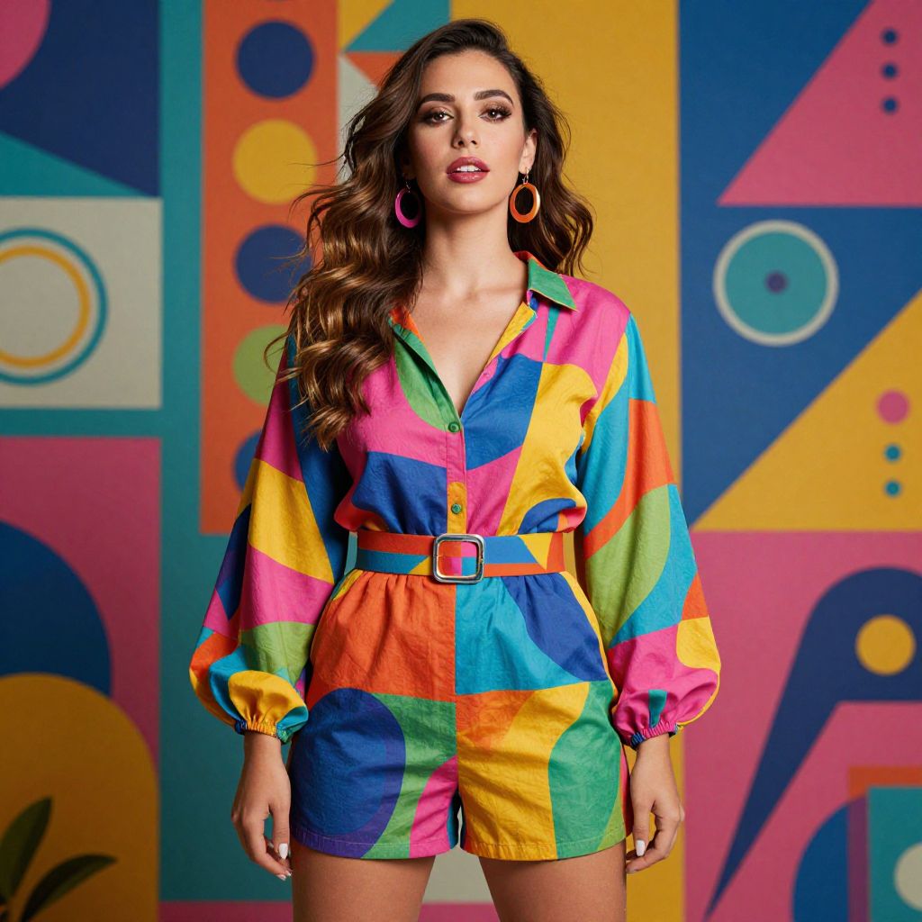 Photograph of a young woman with long, wavy brown hair and light brown skin, wearing a vibrant, color-blocked, long-sleeve romper with a belt. The romper features bold patches of pink, orange, yellow, green, blue, and purple. She has large, pink hoop earrings and a confident expression. The background is a colorful, abstract pattern with geometric shapes in pink, yellow, blue, and orange. The image has a retro, 1970s-inspired aesthetic. The lighting is bright, highlighting her outfit and the vivid colors in the background.