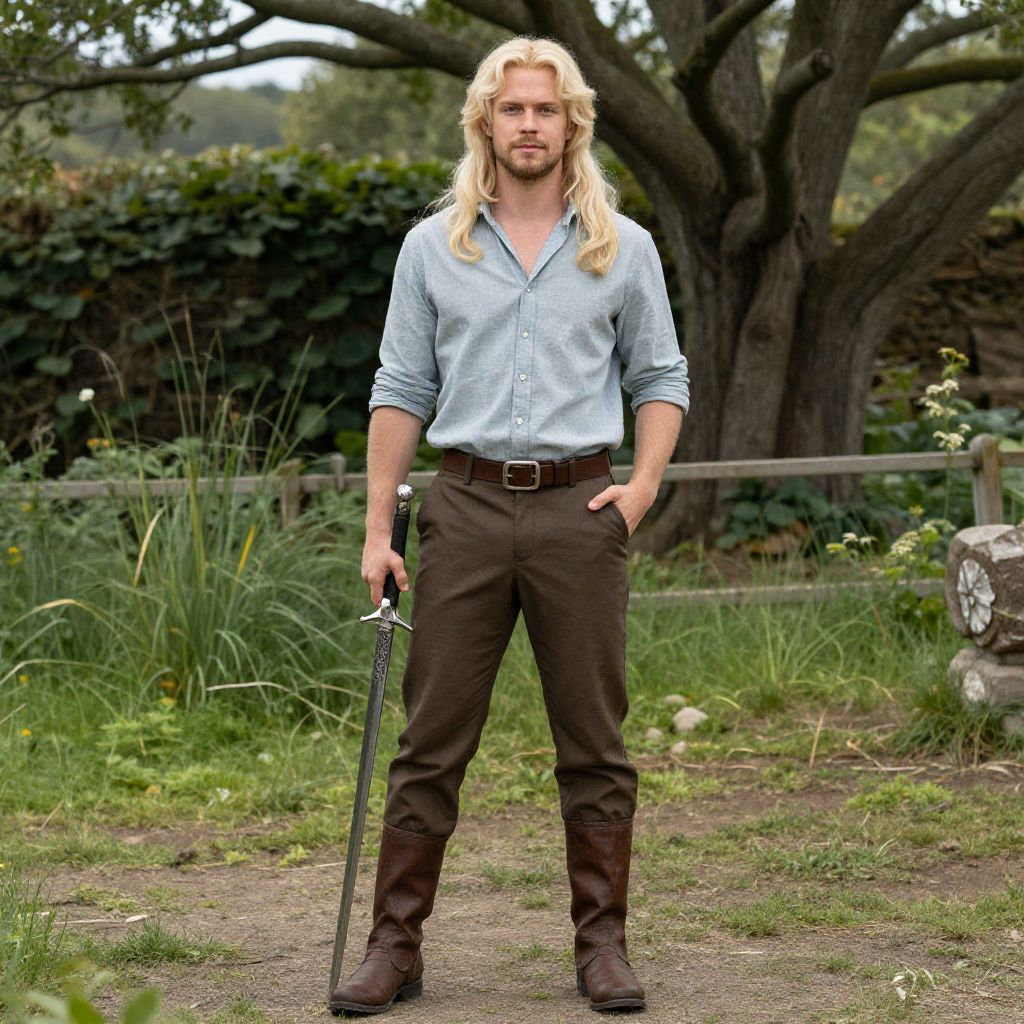 Photograph of a blonde, bearded man with long hair, wearing a light blue shirt, brown pants, and boots, holding a sword, standing