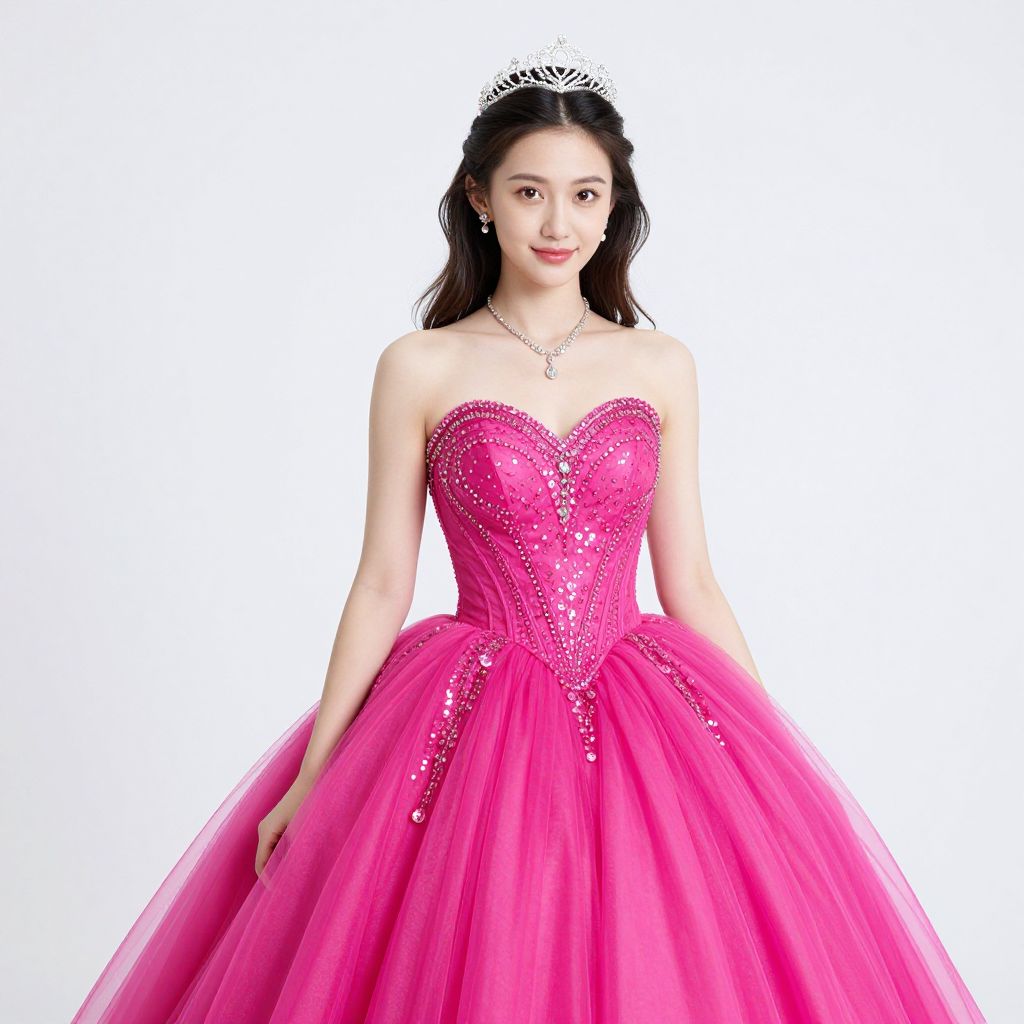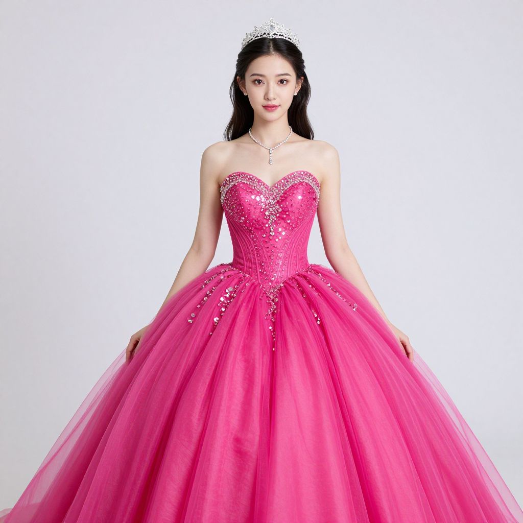 Photograph of an East Asian woman with fair skin and long black hair, wearing a sparkling pink strapless ball gown with a fitted, sequined bodice and a voluminous, tulle skirt. She has a silver tiara on her head and a delicate necklace. The background is plain white, making her and her vibrant pink dress stand out. She stands with a poised, slightly forward-leaning posture, her hands resting on the sides of her skirt. The image is brightly lit, emphasizing the texture and shine of the dress.