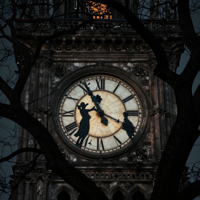 Time whispers its enigmatic secrets through the gnarled branches of an ancient clock tower, where shadowy figures cradle fractured moments, evoking a haunting dance between transience and eternity.