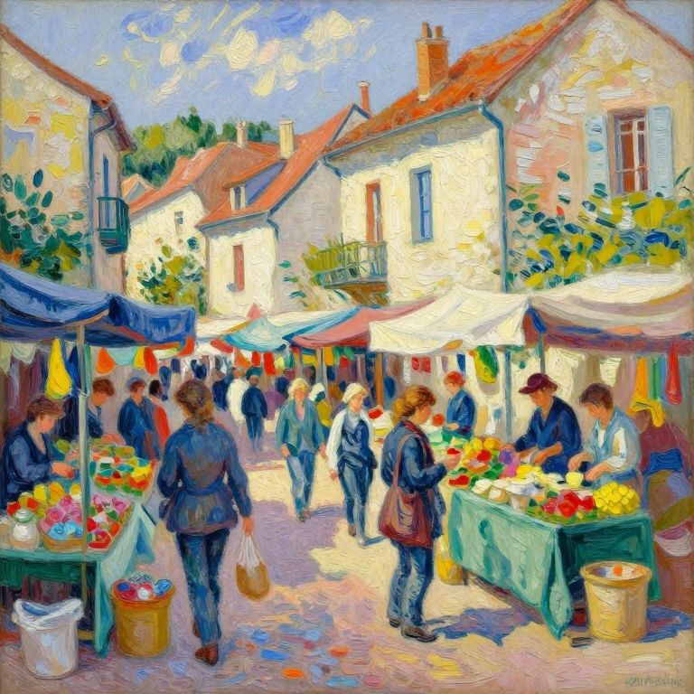Vibrant, impressionist-style painting of a bustling outdoor market with colorful stalls, people shopping, and charming European buildings in the background.