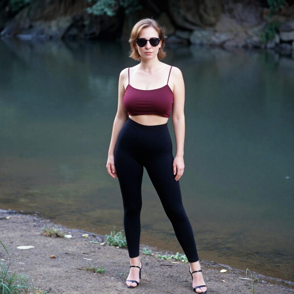 A svelte woman in a chic maroon crop top and black high-waisted leggings, strappy black high heels, and sunglasses, captured in the vibrant visual style of Kodacolor analog film, standing by a serene riverbank. Sexy. Pretty face and beаutiful eyes. Big breasts
