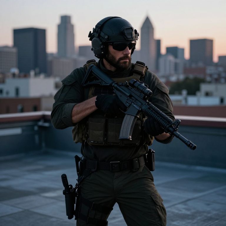 Sicario preparing for a covert mission at dusk, modern tactical equipment and weaponry, urban rooftop setting with city skyline in background, moody lighting emphasizing tension and stealth, photorealistic style with cinematic framing.