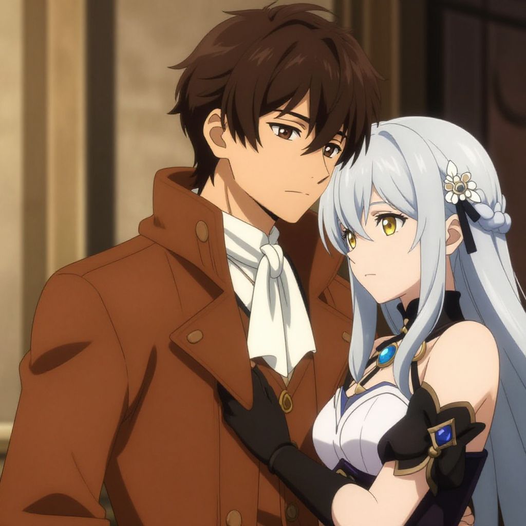 Digital anime-style artwork featuring a young man with brown hair and brown eyes wearing a brown coat and white ascot, standing close to a young woman with long silver hair and golden eyes, dressed in a black and white outfit adorned with a blue gem and floral hair accessories. The scene conveys a calm and introspective mood.