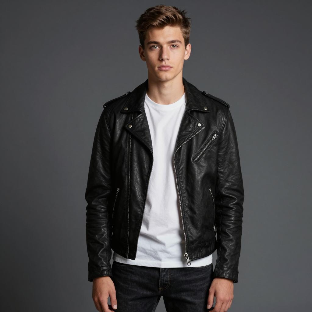 Portrait of a young man with short brown hair wearing a black leather jacket over a white t-shirt and dark denim jeans. The subject has a simple masculine look and stands against a soft gradient dark background.