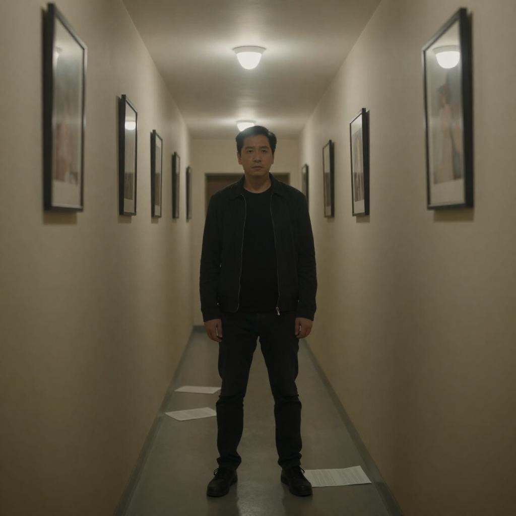 Photograph of a man standing in a dimly lit, narrow hallway with beige walls. He wears a black jacket and dark pants, with a serious expression. The hallway is lined with framed pictures on both sides, and a bright light bulb is visible in the background. Papers are scattered on the floor.