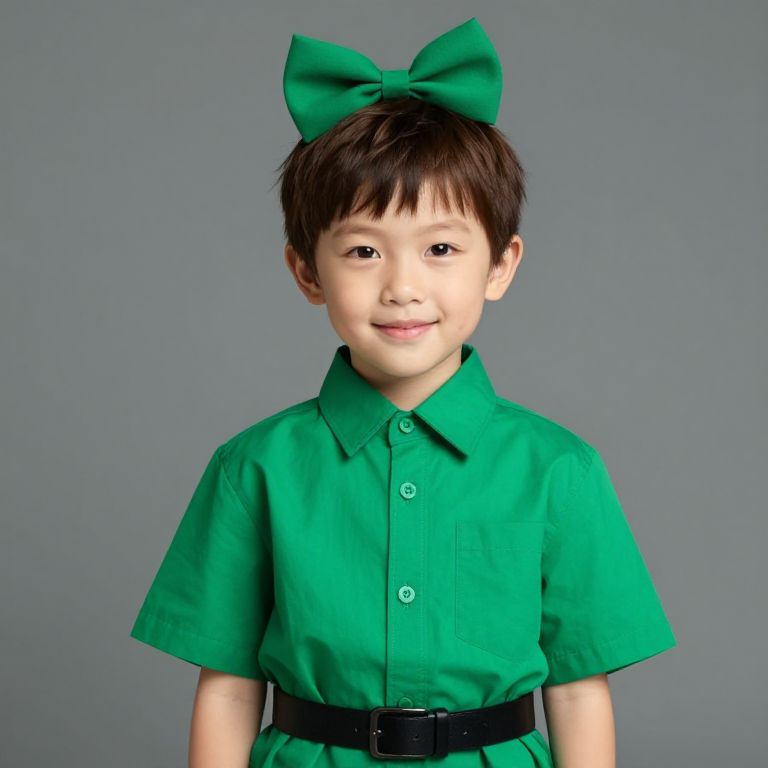 Photograph of a young Asian boy with short black hair, wearing a bright green short-sleeved button-up shirt and a matching green bow on top of his head. The shirt is cinched at the waist with a black belt. He has a light skin tone and a gentle smile, with dark brown eyes looking slightly to the right. The background is a plain, solid gray, making the boy the focal point. The image has a studio-like quality with even lighting and no visible shadows.