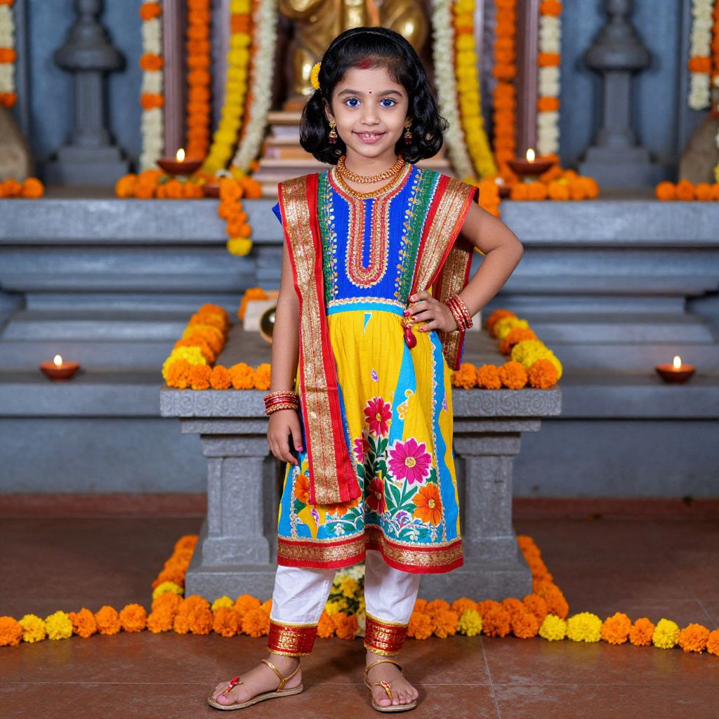 A colorful and authentic portrait of a young girl from Tamil Nadu dressed in a brightly colored Tamil folk costume, including a cotton kurta with floral patterns, a dupatta with red and gold borders, and traditional footwear, her bright blue eyes and curved smile reflecting the festive spirit of Diwali, standing in front of a temple adorned with diyas and marigold flowers.