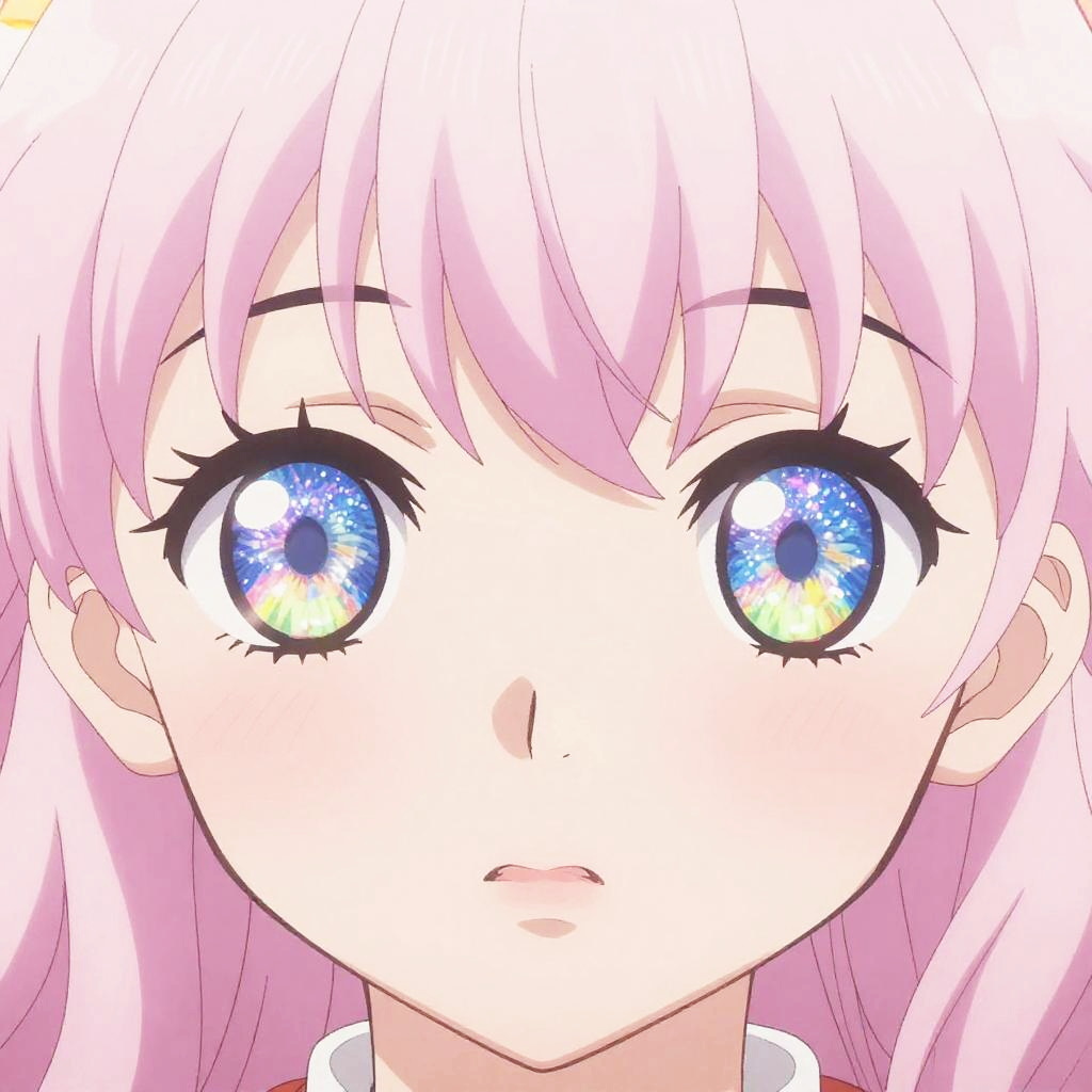 Pretty anime eyes sparkling with vibrant colors, detailed irises with shimmering highlights, surrounded by long delicate eyelashes, soft blush on cheeks, set against a dreamy pastel background, capturing an ethereal and enchanting anime style portrait.