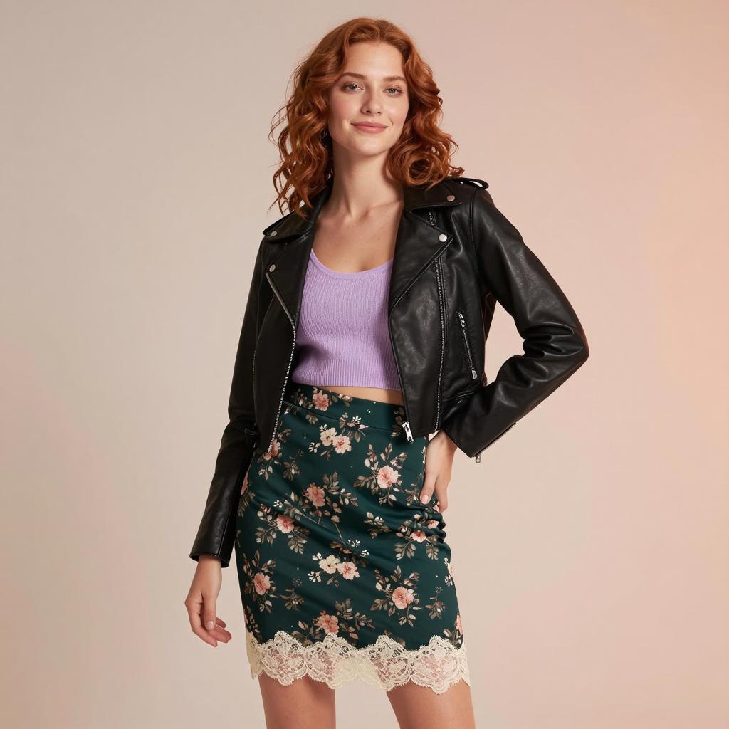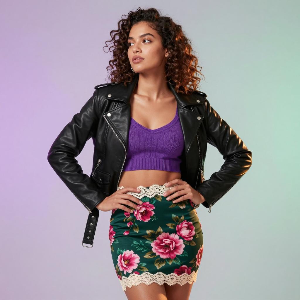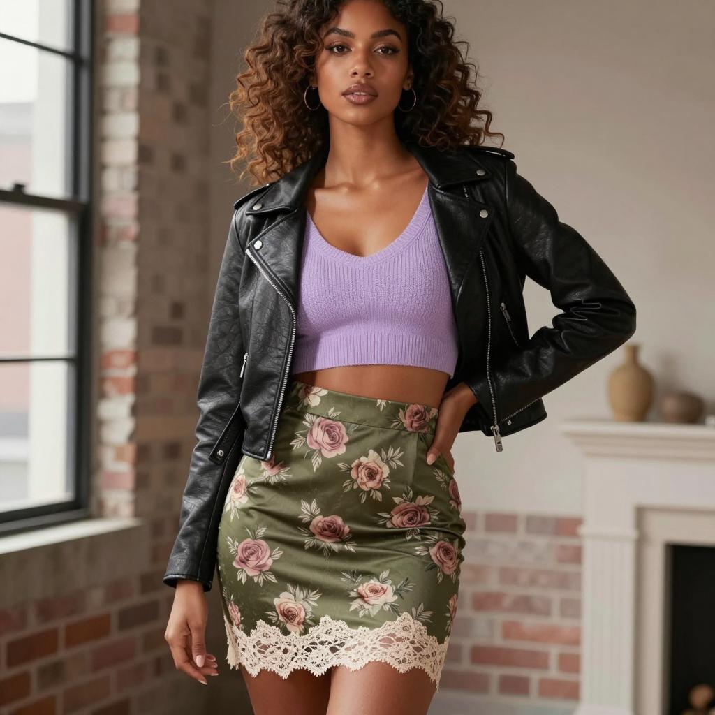 1girl, anime, woman wearing cropped black faux leather biker jacket, scoop-neck knit crop top and high-waisted floral print pencil skirt with contrast lace hem in soft black jacket with ivy green top and burgundy skirt with delicate peach florals and cream lace on olive-skinned woman with curly mid-length hair and natural makeup posed leaning slightly forward with one hand on hip and the other hanging loosely in urban rooftop setting at golden hour with warm tones, warm directional sunlight casting long soft shadows, modern edgy-chic fashion photography, high resolution, ultra-detailed