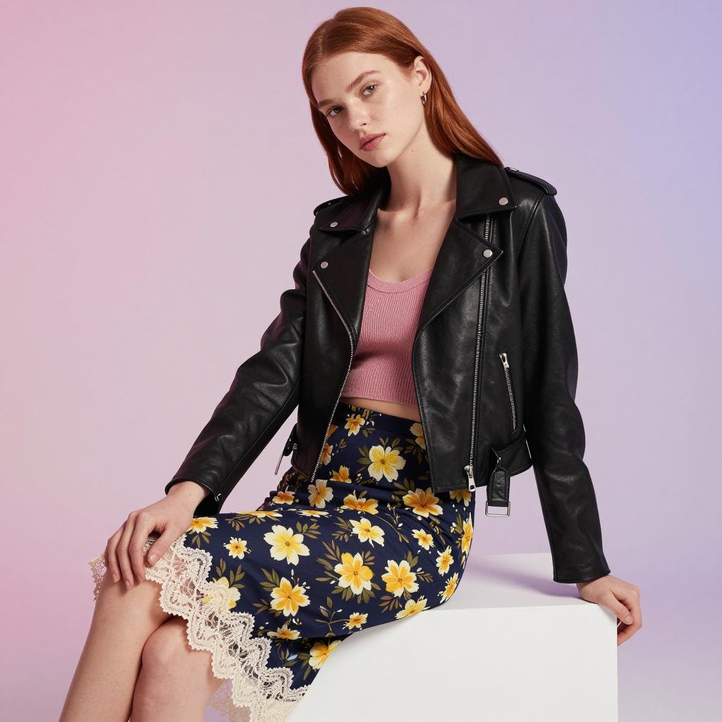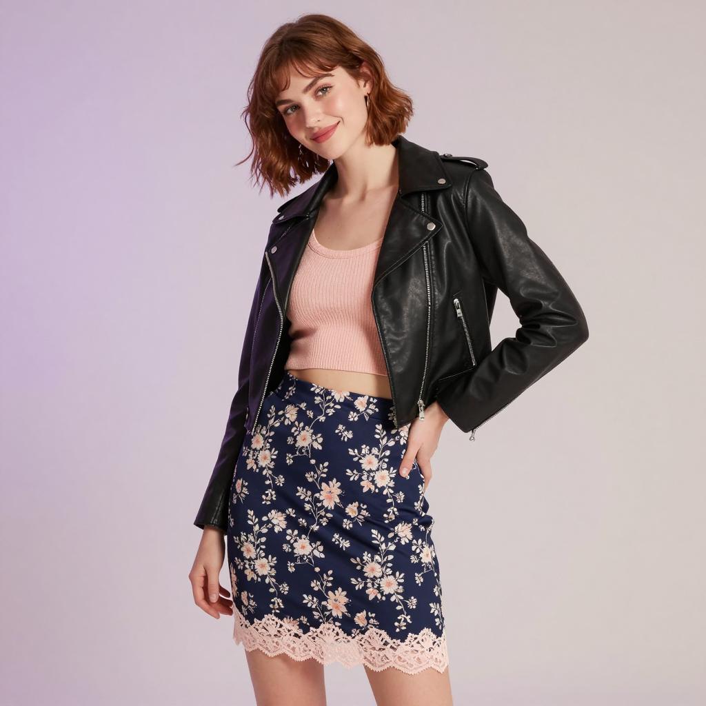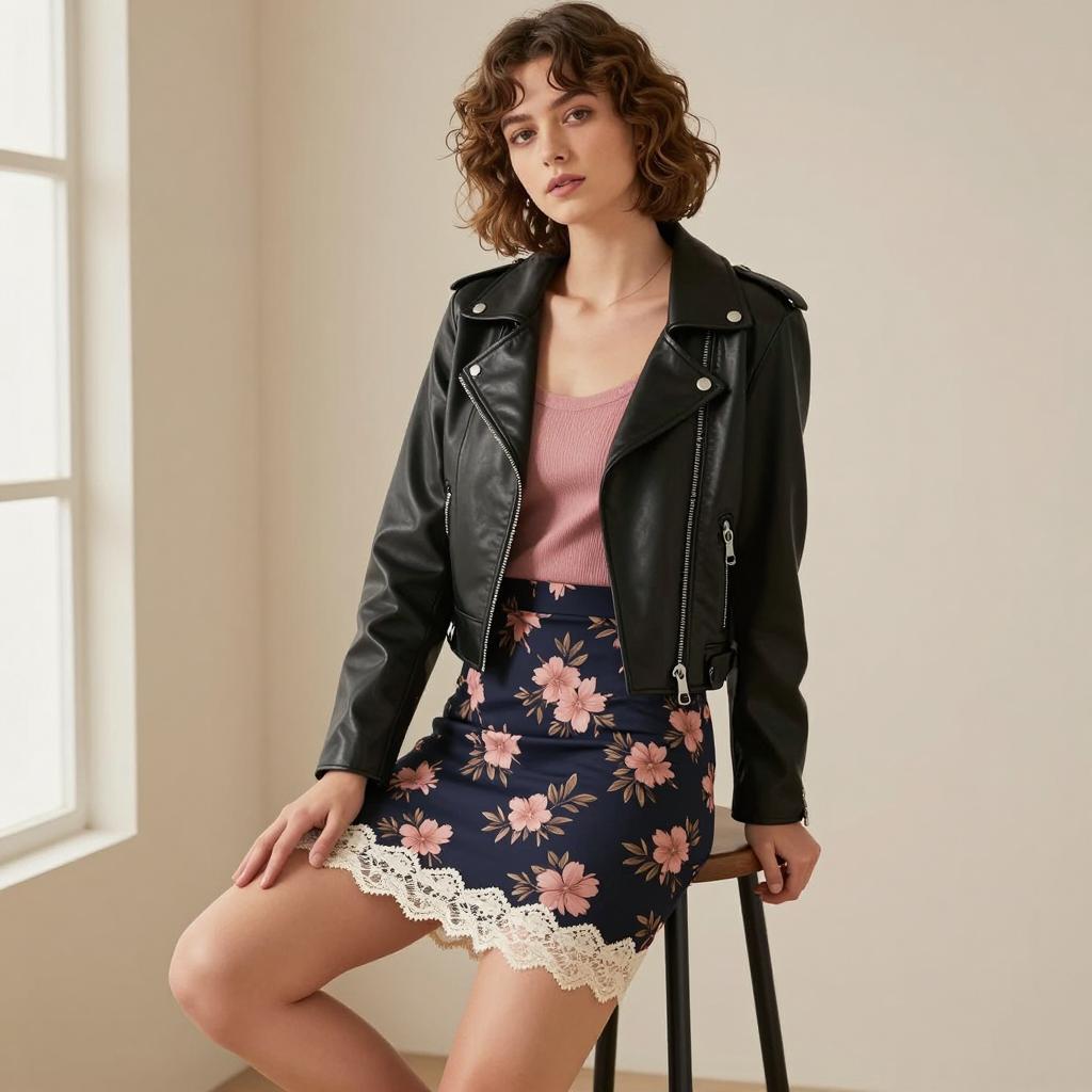 1girl, anime, woman wearing cropped black faux leather biker jacket, scoop-neck knit crop top and high-waisted floral print pencil skirt with contrast lace hem in soft black jacket with ivy green top and burgundy skirt with delicate peach florals and cream lace on olive-skinned woman with curly mid-length hair and natural makeup posed leaning slightly forward with one hand on hip and the other hanging loosely in urban rooftop setting at golden hour with warm tones, warm directional sunlight casting long soft shadows, modern edgy-chic fashion photography, high resolution, ultra-detailed