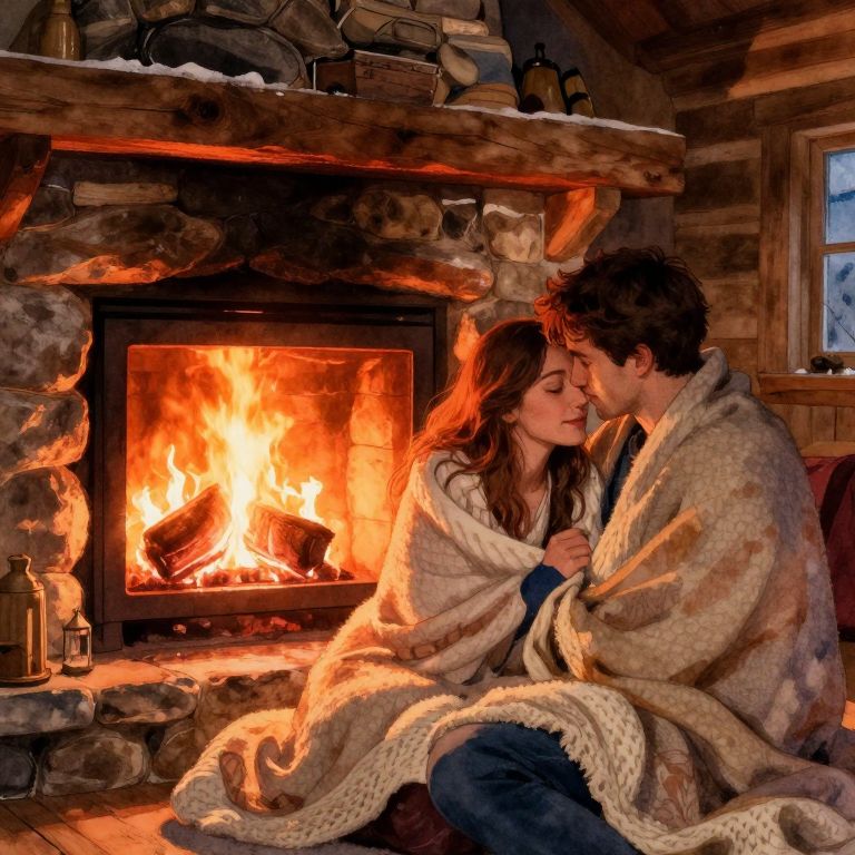 Intimate couple sitting by a roaring fireplace, wrapped in a cozy blanket, sharing a tender kiss in a wooden cabin. Digital art.