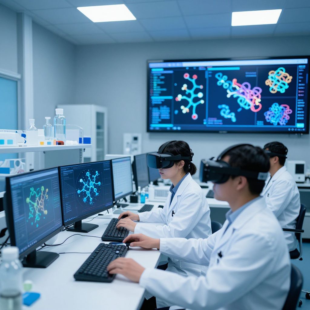 A high-tech medical research laboratory with researchers using VR headsets to visualize molecular structures, surrounded by digital screens showing genomic data and interactive 3D models of proteins.
