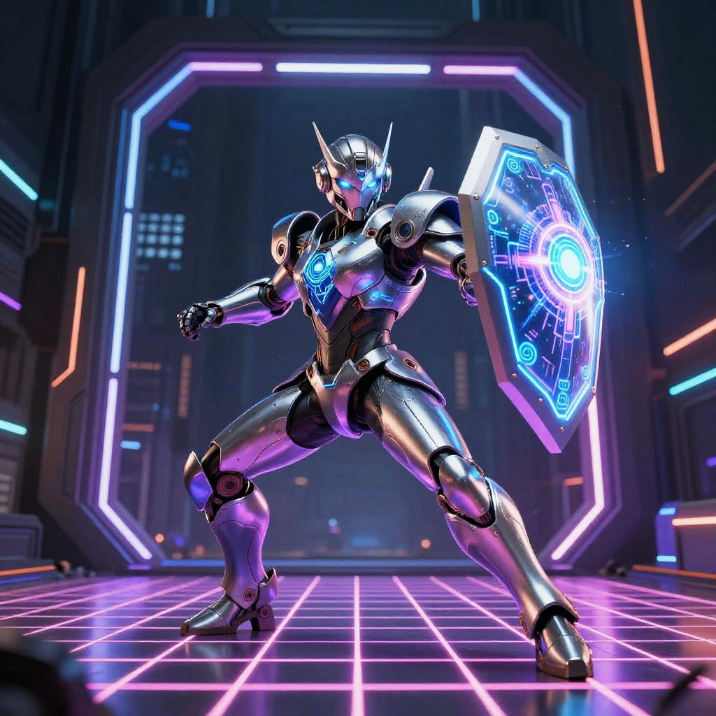 AI warrior emerging from a digital portal, metallic body combined with ethereal holographic elements, dynamic action pose wielding energy shield, neon grid ground, dark futuristic urban setting, vivid colors blending tech and fantasy aesthetics.