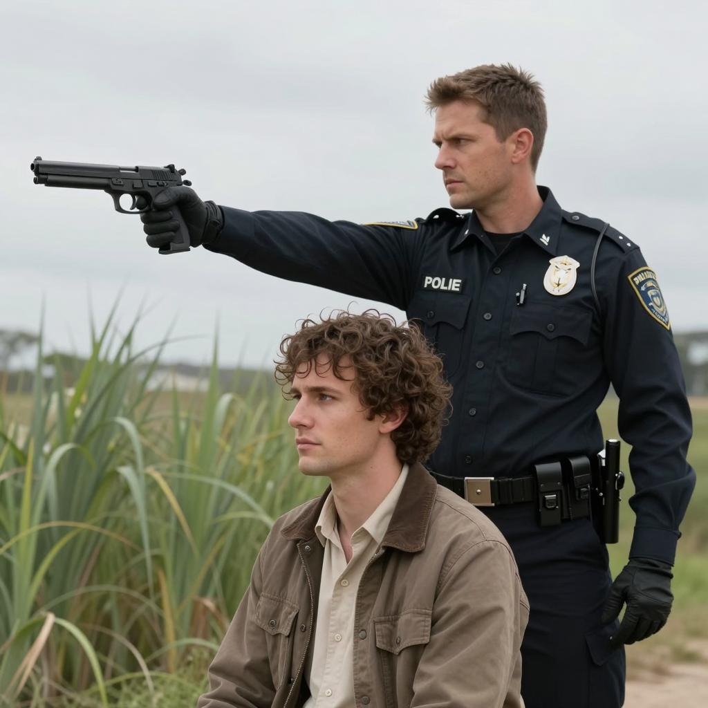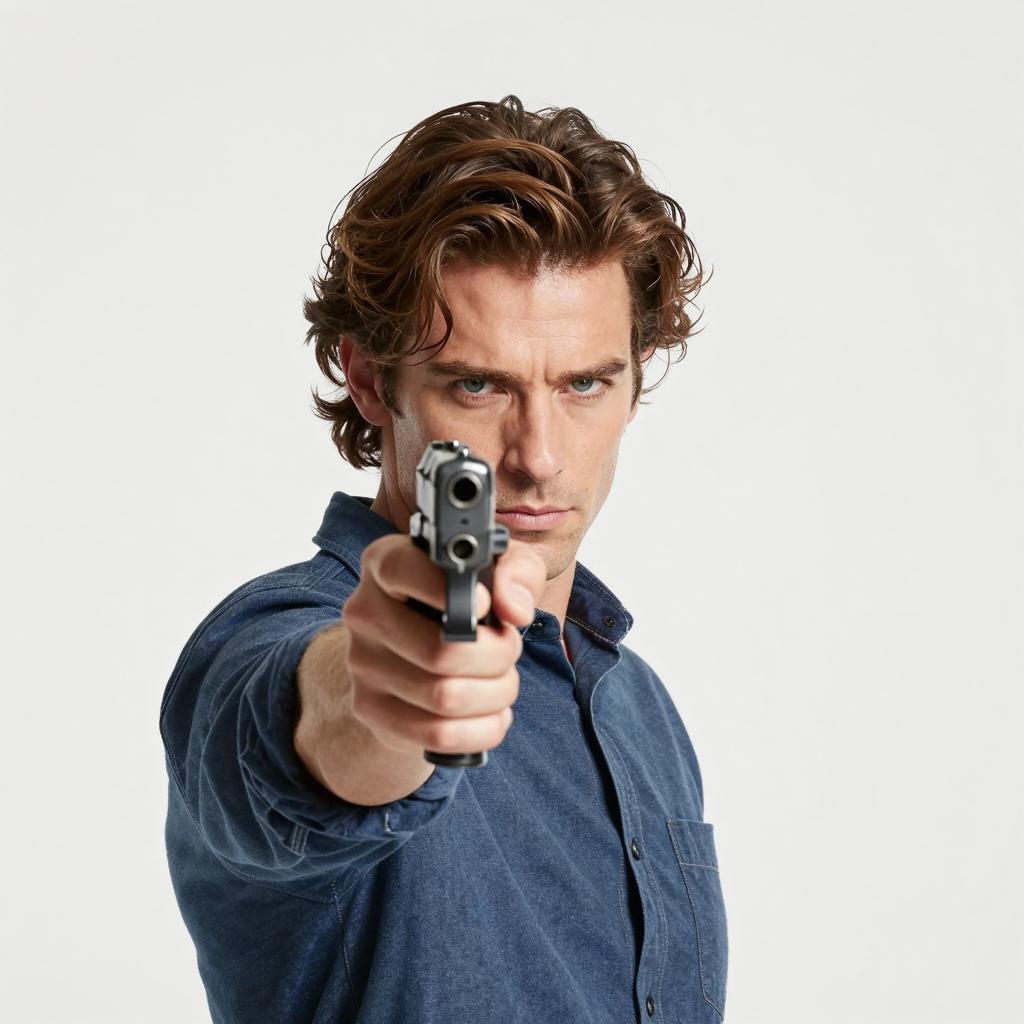 A man with light brown, curly hair pointing a handgun directly at the camera. He has a serious expression, fair skin, and wears a white shirt with a ruffled collar. Green forest background. His right hand grips the gun, and he wears a silver ring on his index finger. The gun is in the foreground, blurred.