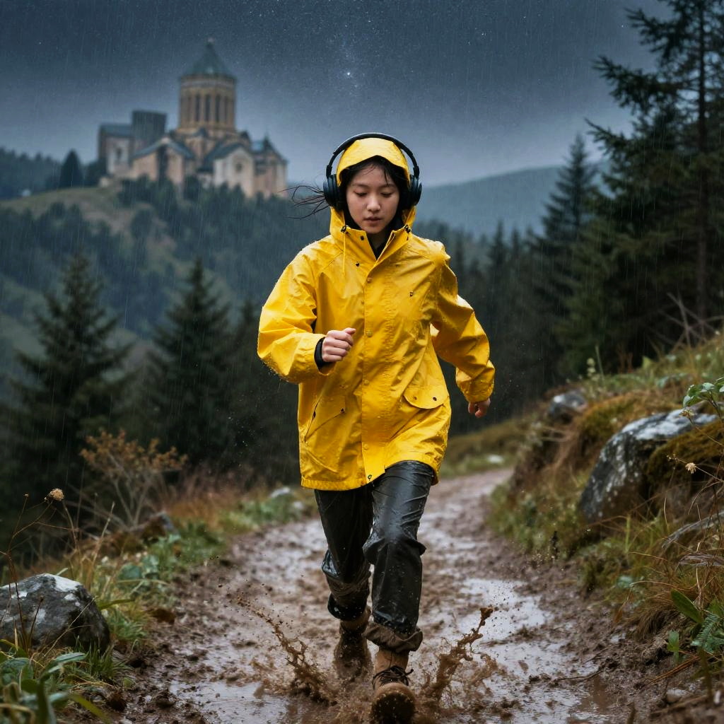 Closeup sexy girl with headphones in yellow raincoat jogging in the mountain forest, rain, wind, muddy trail, splashing mud and water, starry sky, distant mountains with cathedral ruins, frontal view, 8k, epic realistic, ultra detailed, dramatic perspective