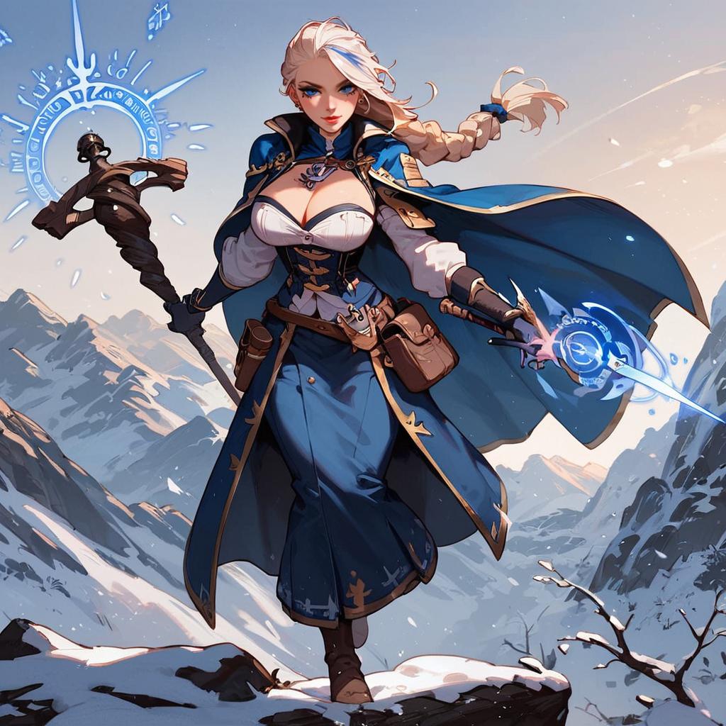 Core_9, score_8_up, score_7_up, score_6_up, score_5_up, source_cartoon, uncensored, , a girl is casting ice magic spell in dynamic pose, (holding staff, casting spell, magic:1.1), planted staff, jaina proudmoore, 1girl, mature female, full body, confident, open mouth, anchor necklace, white hair, blonde hair, single braid, streaked hair, blue eyes, corset, single pauldron, cape, cropped jacket, detached sleeves, single gauntlet, gloves, blue pants, long skirt, belt pouch, knee boots, curvy, large breasts, cleavage, outdoors, winterstorm, mountains, winter, twilight