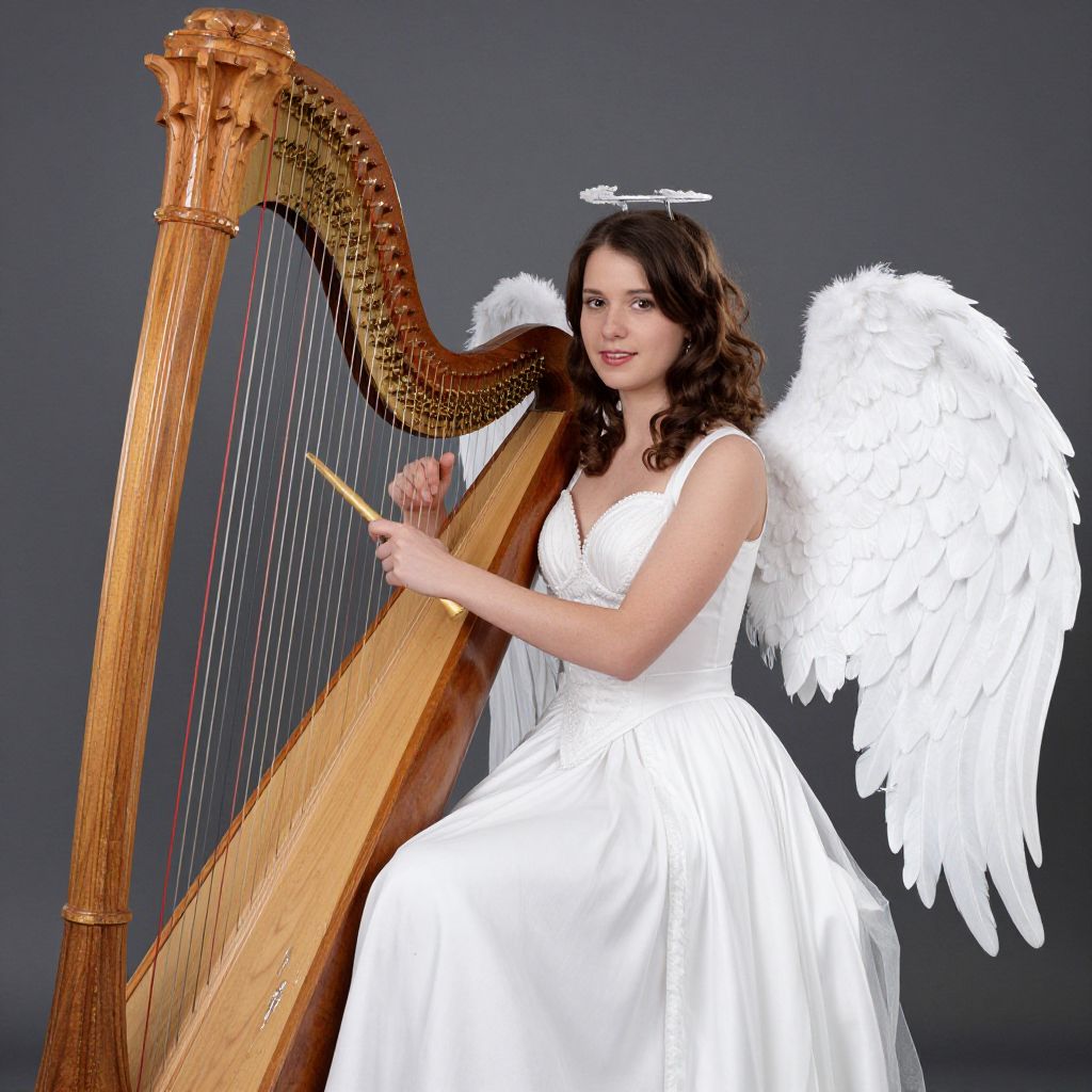 Angel Harp Costume, woman in white dress holding a harp and a wooden stick