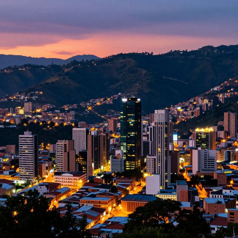 Medellín cityscape at dusk, showcasing vibrant urban lights and lush green mountains surrounding the valley, with modern skyscrapers and colonial architecture blending seamlessly, under a colorful sunset sky, atmospheric and vivid detail.