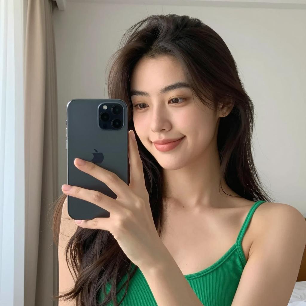 Photograph of a young woman with long, wavy dark brown hair, wearing a green spaghetti-strap top, holding a black smartphone in her right hand, taking a selfie. She has dark eyebrows, light skin, and a slight smile. Background includes a window with sunlight and beige curtains. She is centered, looking down at the phone, with soft natural light.