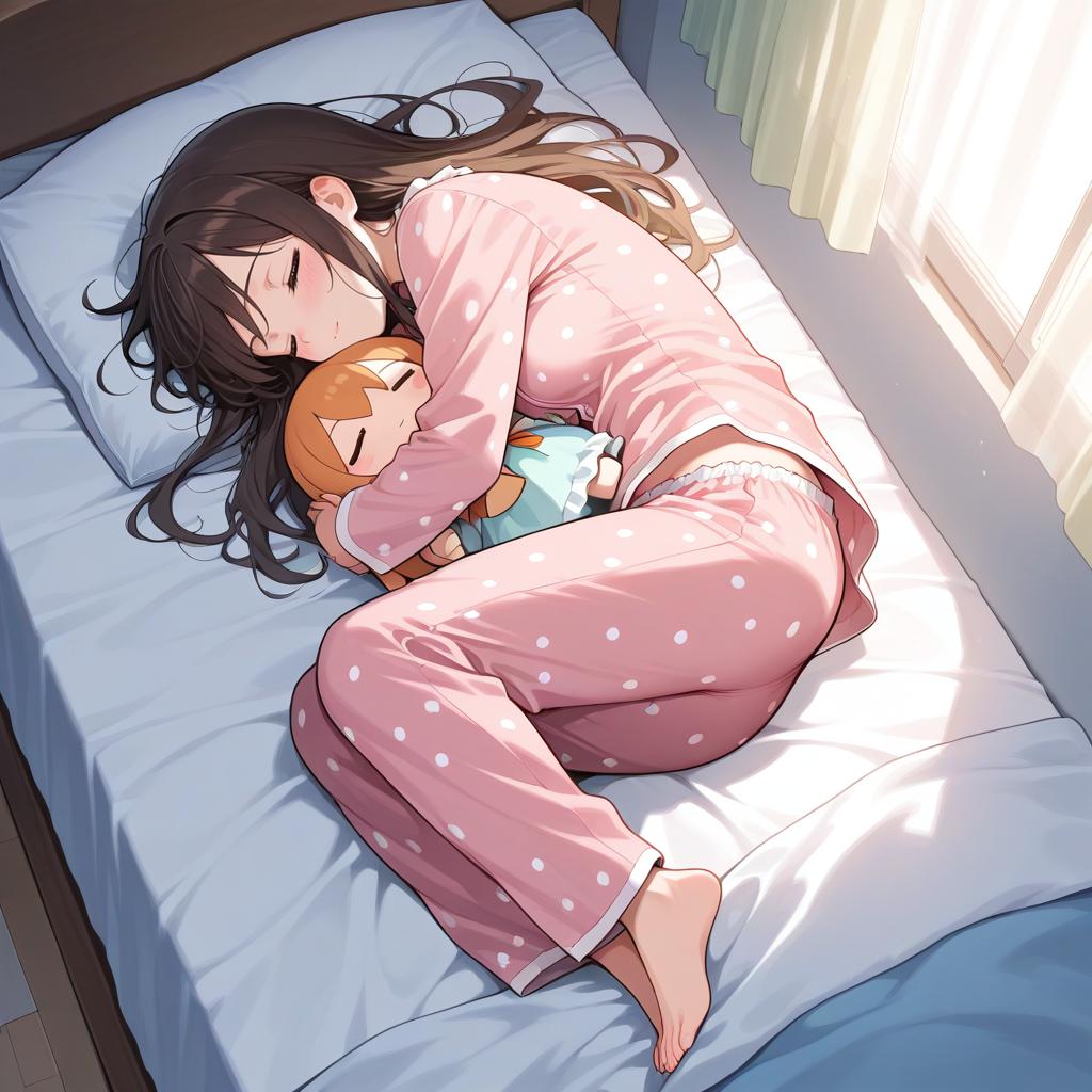 (best quality, masterpiece), 1girl, sleeping, pajamas, from above, bed, girl's room, hug doll
