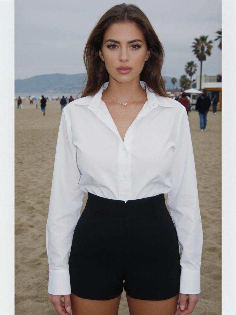A woman in a white collared button-down shirt and black tailored shorts, minimal jewelry, captured in a lomography analog photo style at a fashionable boardwalk in Santa Monica. Sexy. Pretty face and beаutiful eyes. Big breasts
