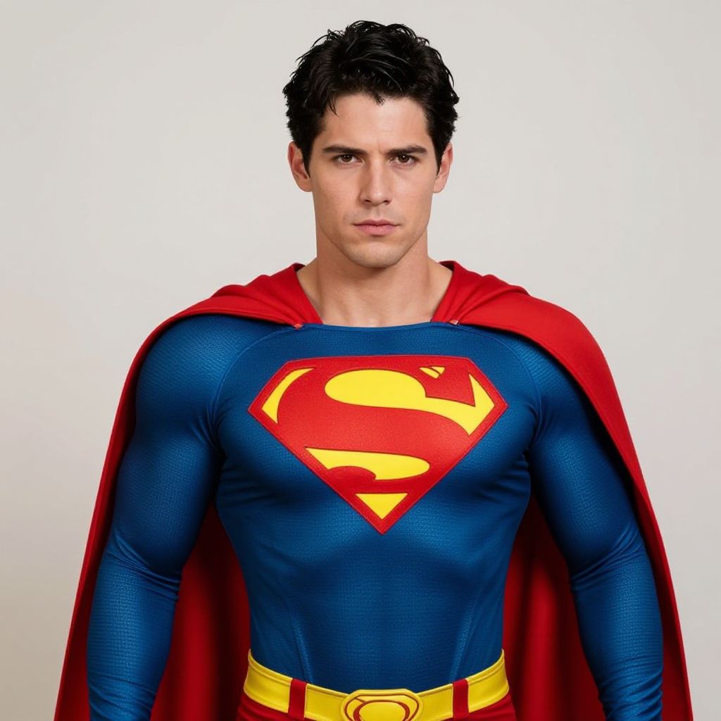 "cosplay superman costume, 1boy, male focus, solo, red cape, cape, superhero, black hair, muscular, bodysuit, short hair, western comics (style), muscular male, realistic, standing Realistic photo of casual sexy person with pretty face"