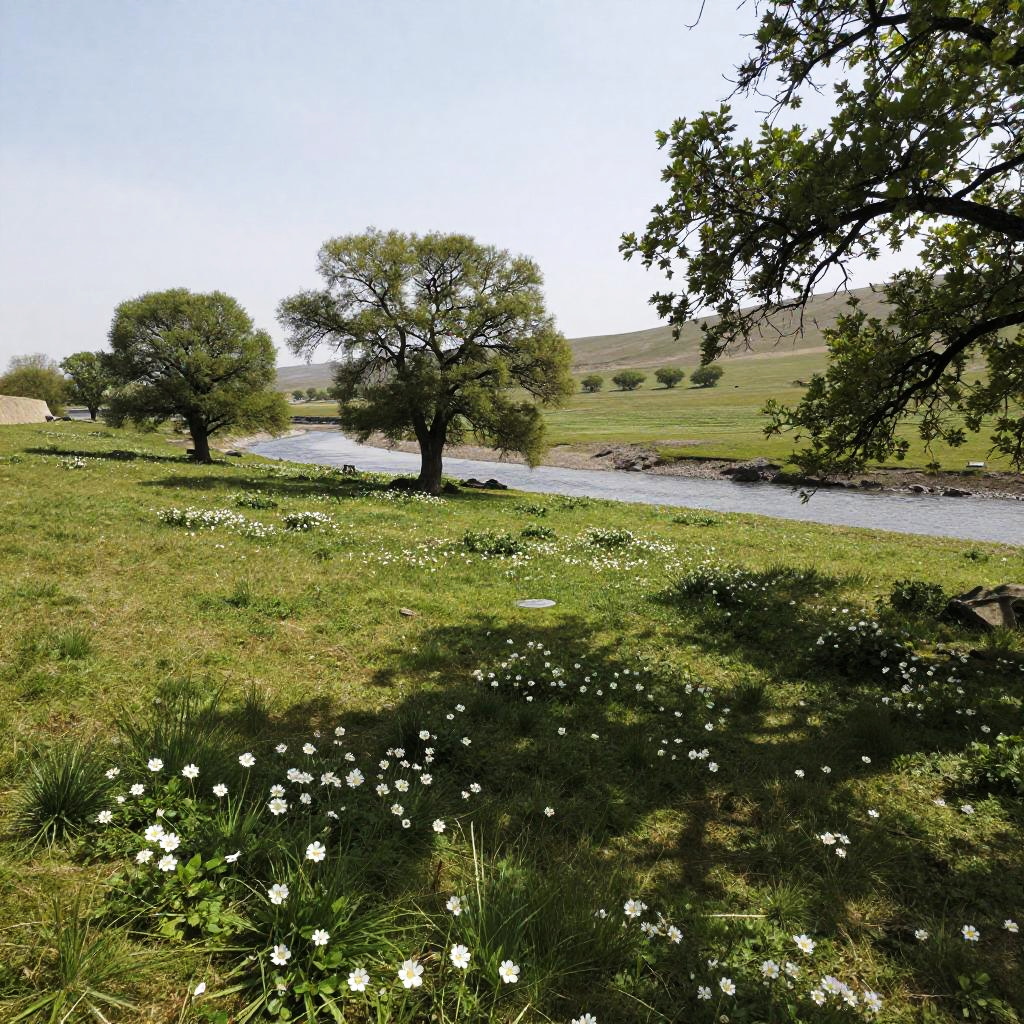 Photograph of a blooming alpine meadow with manicured greens, winding river, and oak trees casting shadows. Wide-angle lens (24mm) with shallow depth of field, serene and tranquil atmosphere, high-quality landscape photography.