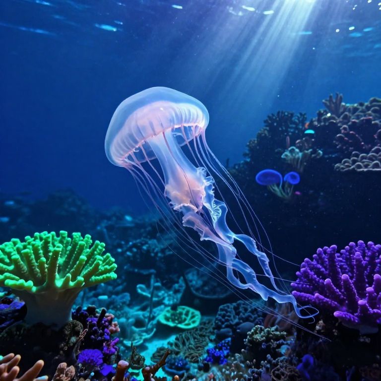 Create an enchanting underwater scene where bioluminescent coral formations in vivid shades of neon blue, green, and purple create a captivating landscape. From an aerial viewpoint, a serene jellyfish with translucent, pulsating bell-like bodies gracefully drifts through the water column, its delicate tentacles trailing behind it like tendrils of silk. As sunlight filters down from above, it casts dancing beams of light that illuminate the tranquil yet mysterious depths, evoking feelings of serenity and wonder in this ethereal underwater world, reminiscent of dreamlike paintings.