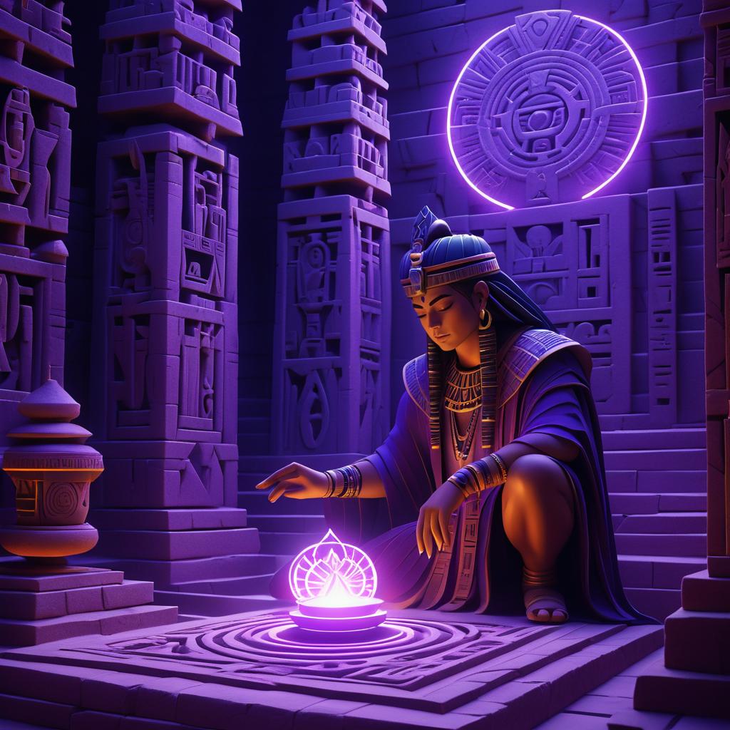 A mysterious sorcerer dressed in traditional ancient Egyptian attire, standing in a dimly lit temple adorned with hieroglyphic carvings and stone columns. The sorcerer is conjuring a glowing magical symbol over a circular stone altar, illuminated by purple and blue ambient light, evoking an atmosphere of mystical ritual and ancient power.