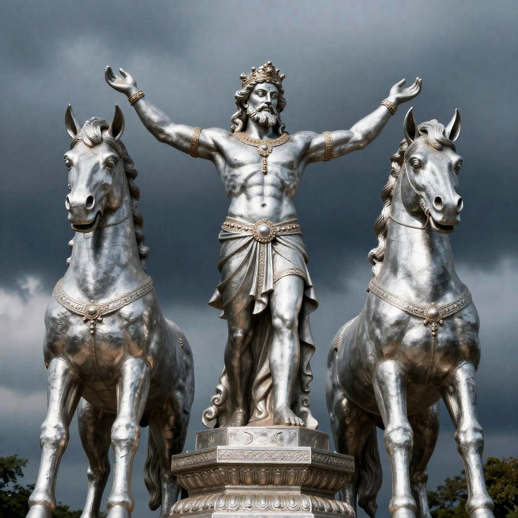 Statue of a muscular, bearded man with arms outstretched, standing between two large, silver, horned, horse-like creatures. Dark cloudy sky in background. Man wears ornate necklace and loincloth, standing on an elaborate, patterned pedestal. Dramatic lighting.